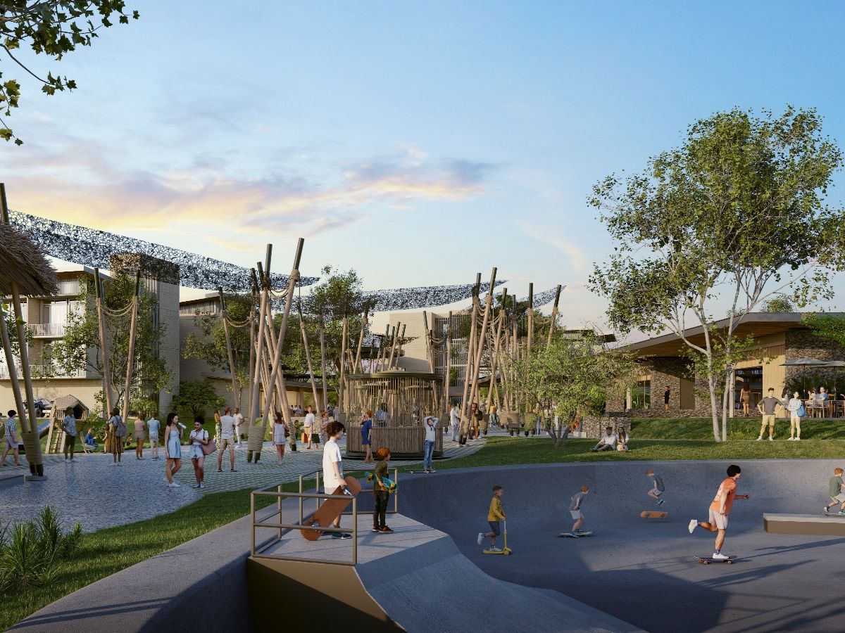 Vida y convivencia en la plaza central: áreas recreativas, cafés y un skatepark pensados para la comunidad, la educación ambiental y la generación de empleo local dentro del plan “Juntos desde la raíz”.