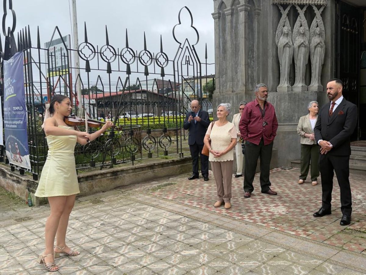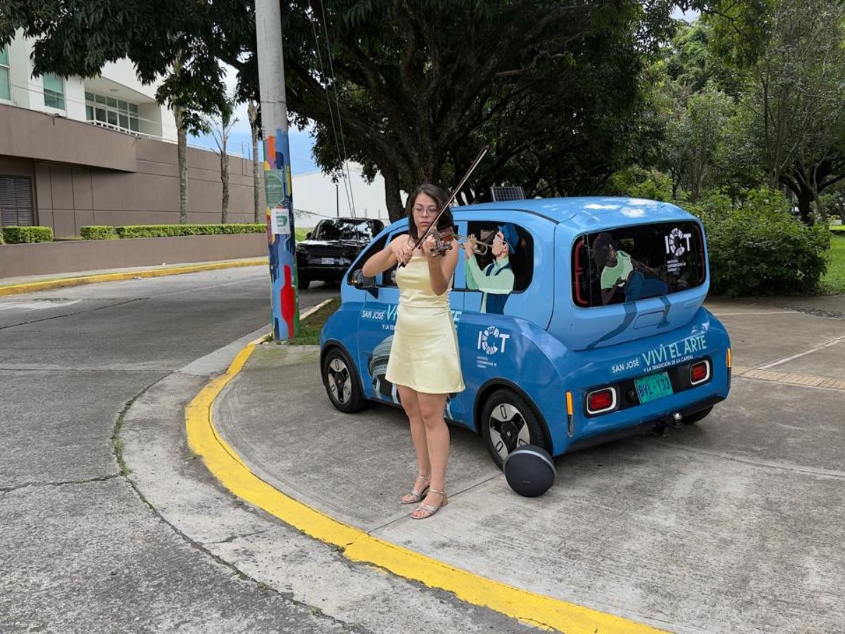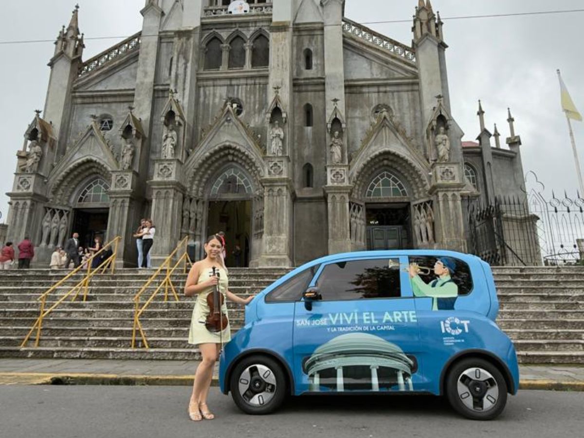 Ahora, abra los ojos y afine los oídos para sorprenderse con una violinista interpretando composiciones del repertorio costarricense como “Soy Tico”, “La Patriótica Costarricense”, “La Guaria Morada” en los mismos lugares y transportada en un compacto vehículo eléctrico con imágenes que promueven el turismo urbano, el arte, la cultura y la gastronomía en nuestra capital y zonas circunvecinas.