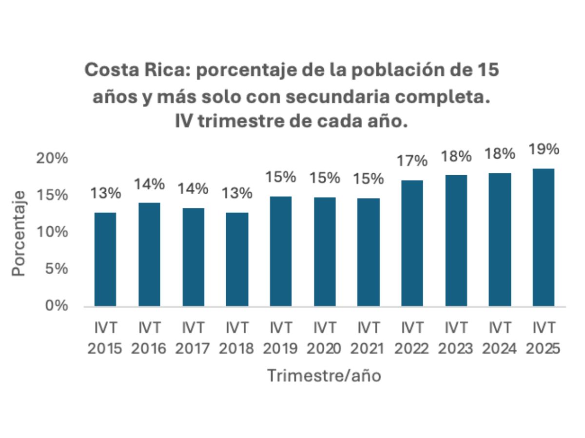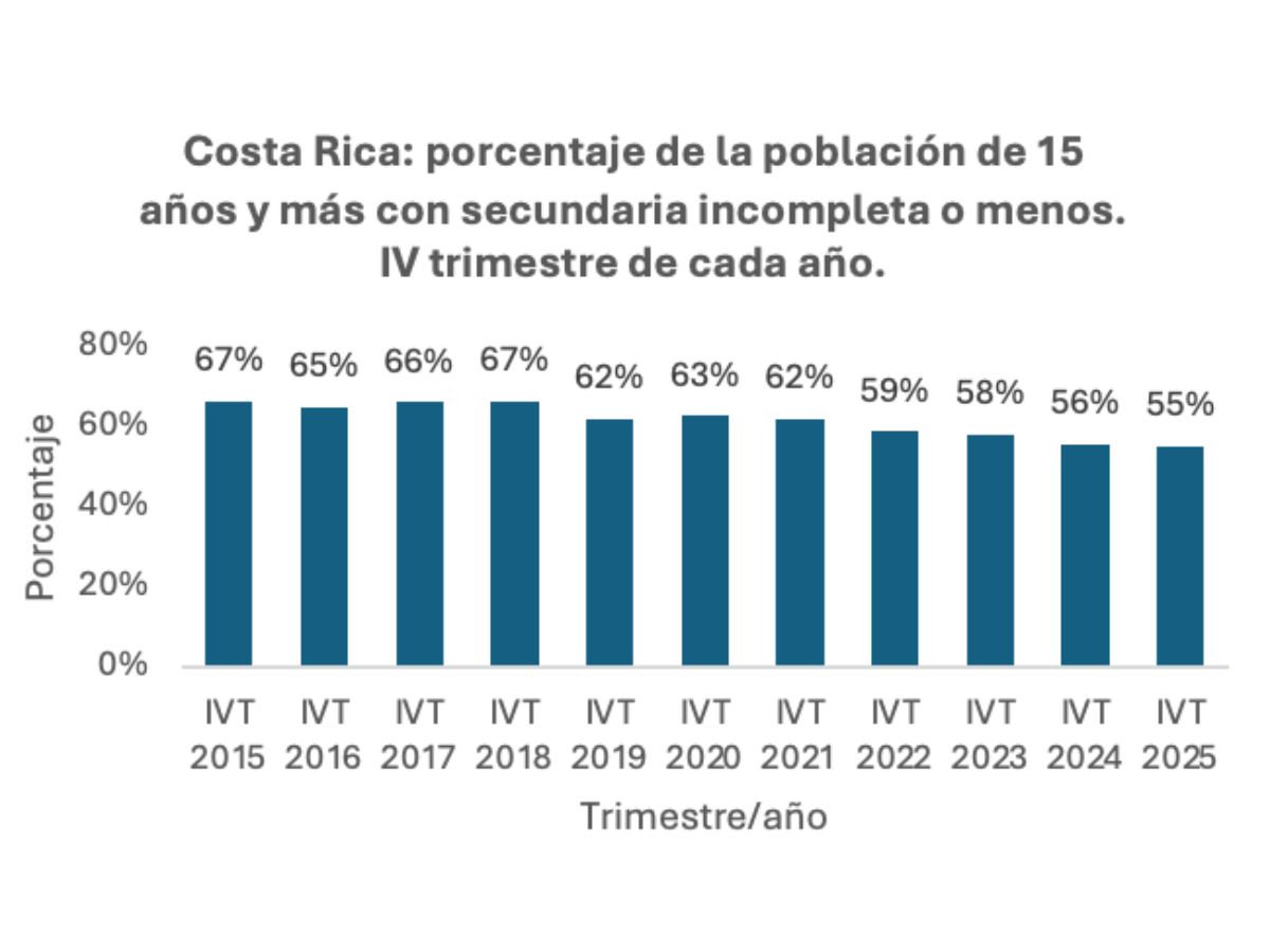 En los últimos diez años, según datos de la Encuesta Continua de Empleo del Instituto Nacional de Estadística y Censos (INEC), Costa Rica ha registrado un avance importante en el nivel educativo de la población de 15 años y más. La comparación entre el IV trimestre de 2015 y el IV trimestre de 2025 evidencia una mejora consistente en la estructura educativa del país.