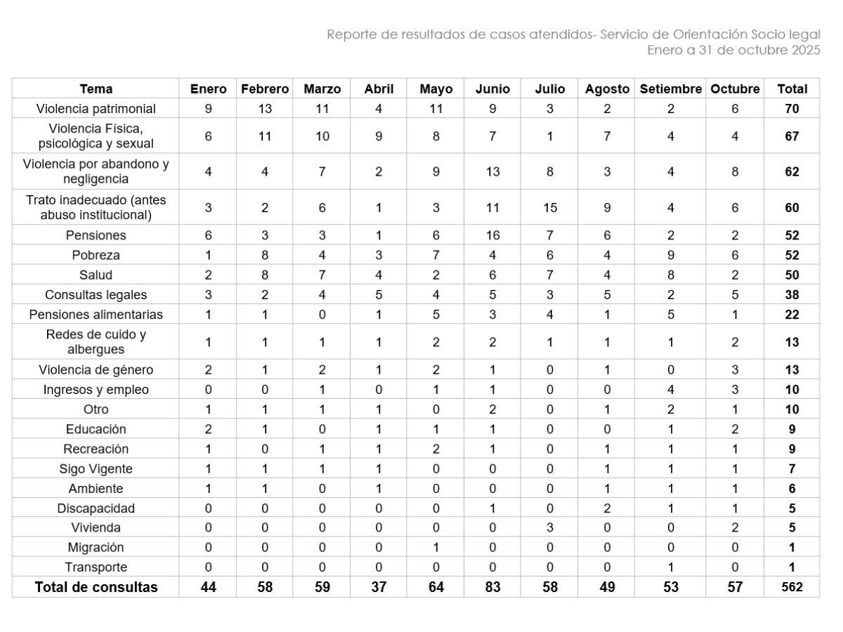 Se acerca el fin de año con estadísticas reveladoras. Como resultado de las llamadas en el período desde enero 2025 hasta el mes de octubre fueron atendidas un total de 562 llamadas de personas adultas mayores de las cuales 272 (casi la mitad) están relacionadas con situaciones de violencia. El mayor número de llamadas en estos 10 meses fue para la categoría de violencia patrimonial con 70 llamadas; los datos son muy similares en violencia física, psicológica y sexual en la que se respondieron 67 consultas telefónicas. En materia de violencia por abandono y negligencia 62 personas emplearon la línea y por trato inadecuado o violencia institucional 60 personas requirieron del servicio. En violencia de género 13 personas solicitaron atención.
