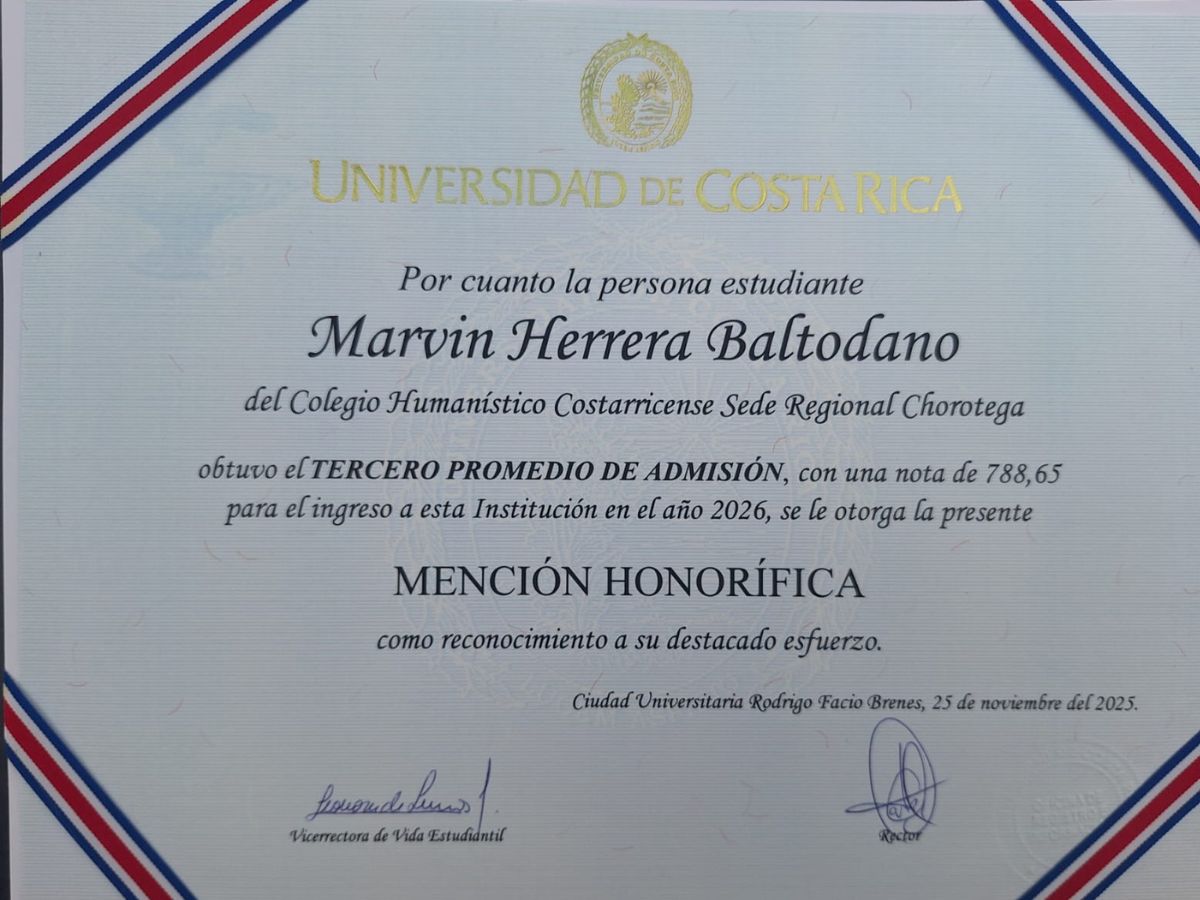 Un joven amante de la química y las matemáticas, quien reside en la comunidad de Gamalotal de Nicoya, entró en los campos de la educación superior directo a la cima de la Universidad de Costa Rica (UCR) donde alcanzó los 788,65 puntos en el examen de admisión 2025 en esa Alma Mater.