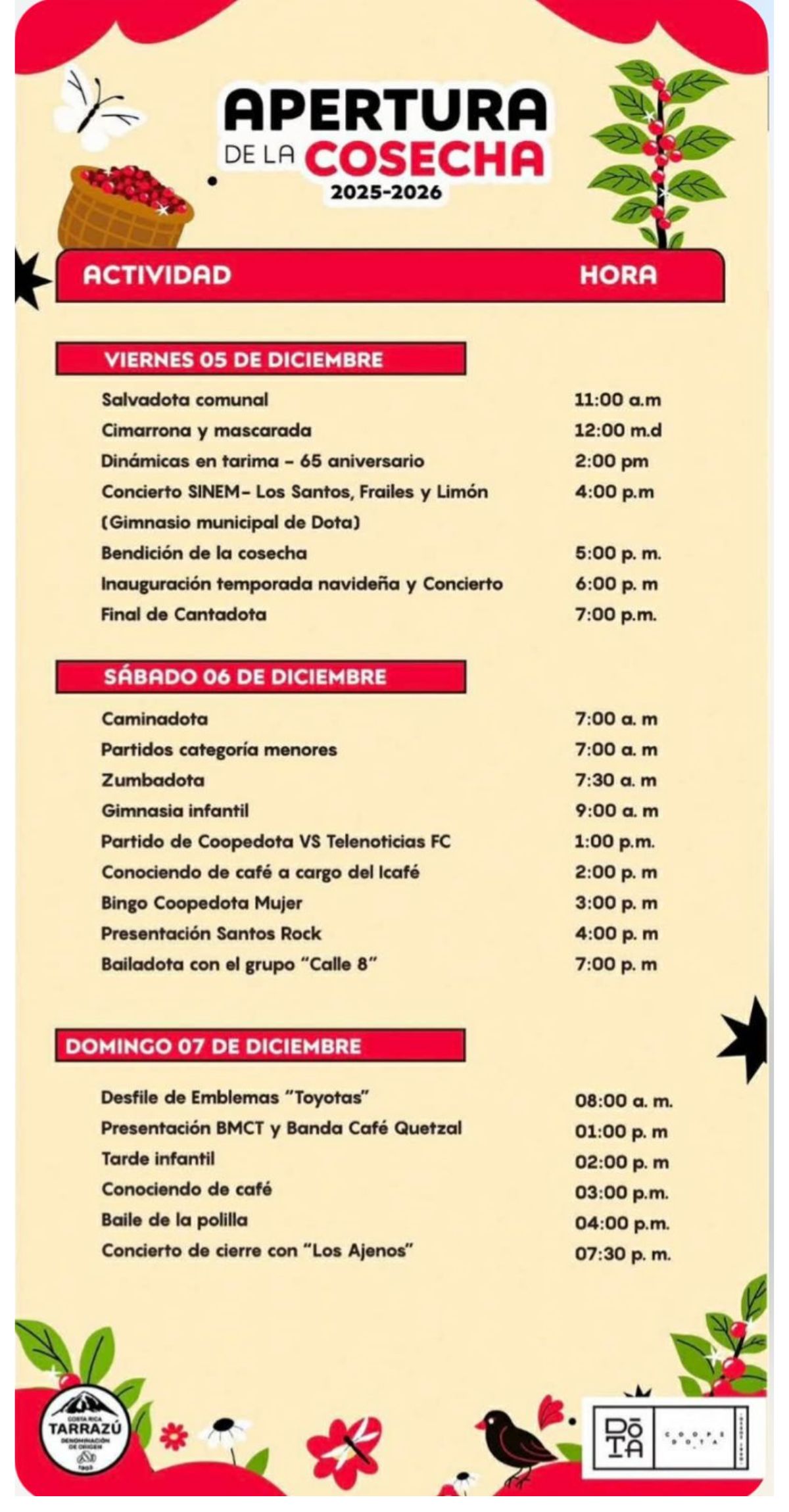 El viernes 5 de diciembre será el inicio oficial de la cosecha de café 2025-2026 en los cantones de Dota, Tarrazú y León Cortés y para celebrarlo, CoopeDota R.L. tiene preparada alrededor de sus instalaciones en Santa María, una agenda especial durante todo el fin de semana con actividades llenas de cultura, café y tradición abiertas al público.