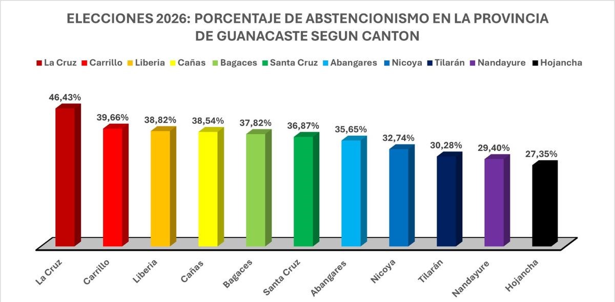 La información del TSE señala que el mayor porcentaje de abstencionismo en la provincia se registró en el cantón de La Cruz (46,43), mientras que el más bajo ocurrió en Hojancha (27,35 por ciento).