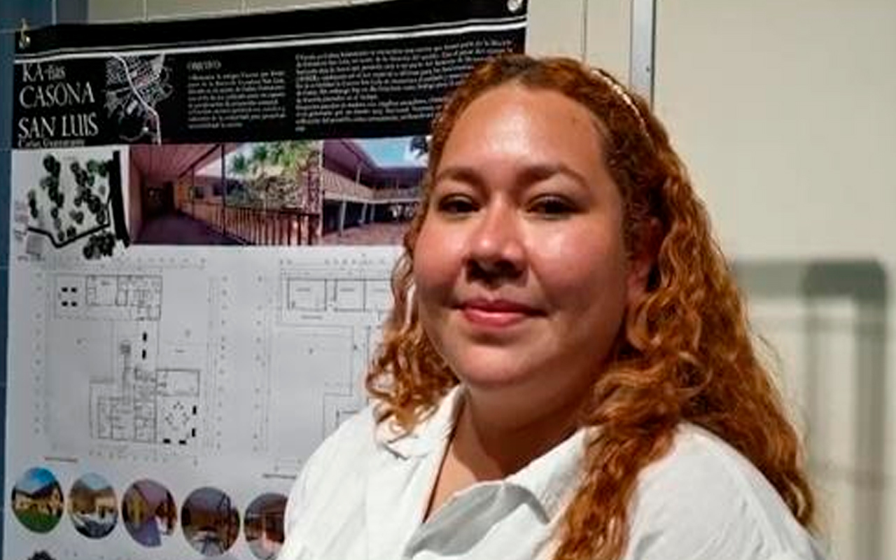 La arquitectaKimberly Díaz, ganadora del certamen Salvemos Nuestro Patrimonio Histórico-Arquitectónico 2022, posa junto a la lámina del anteproyecto ganador: la Casona de la Hacienda San Luis en Cañas, actualmente administrada por el Colegio Técnico Profesional. Se espera que luego de su restauración la infraestructura sea aprovechada por estudiantes de Turismo. Por: LLópez-CICPC.