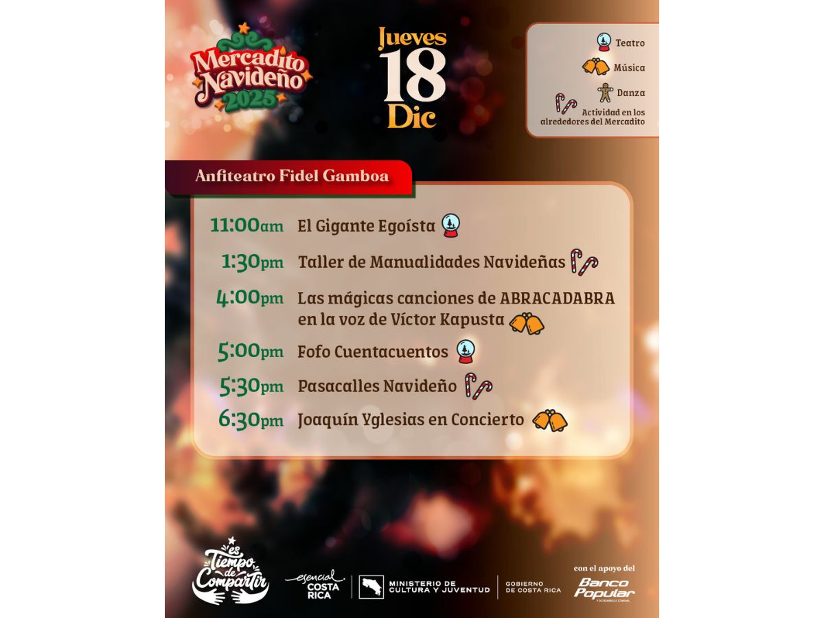 La jornada inicia con la obra “El gigante egoísta” y cerrará con un emotivo concierto de Joaquín Yglesias (6:30 p. m.), quien llenará el Anfiteatro Fidel Gamboa de villancicos y clásicos navideños.