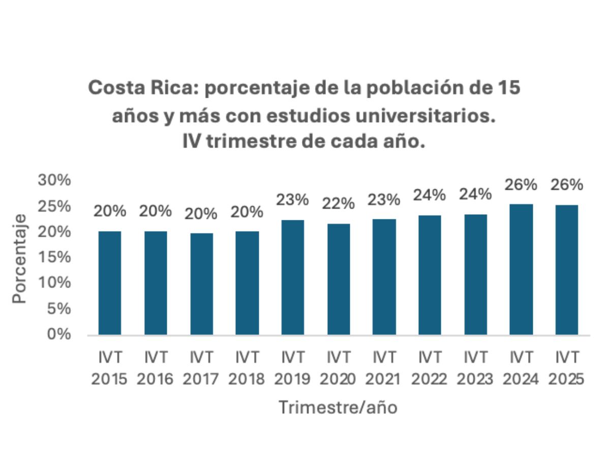 En los últimos diez años, según datos de la Encuesta Continua de Empleo del Instituto Nacional de Estadística y Censos (INEC), Costa Rica ha registrado un avance importante en el nivel educativo de la población de 15 años y más. La comparación entre el IV trimestre de 2015 y el IV trimestre de 2025 evidencia una mejora consistente en la estructura educativa del país.