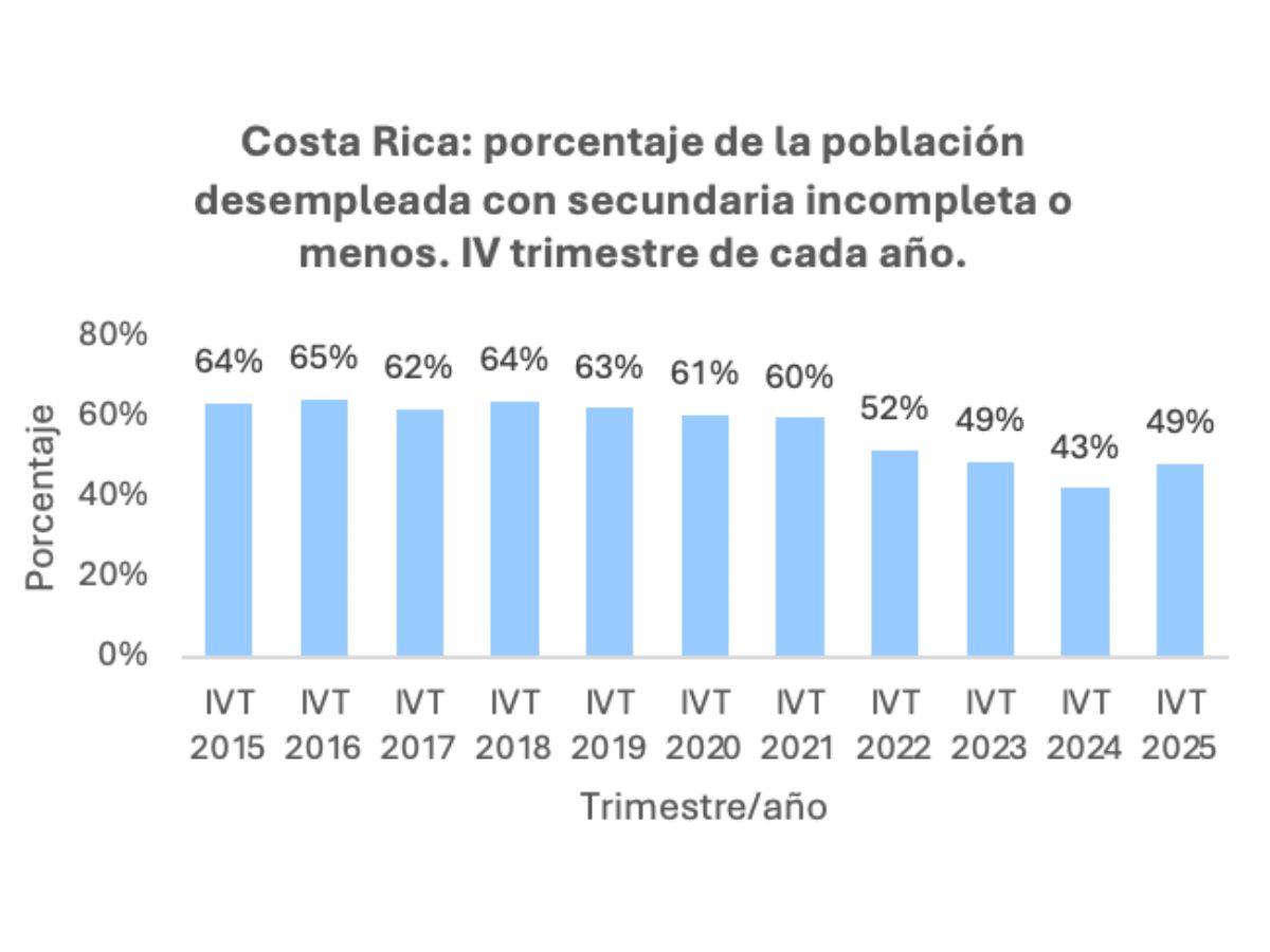 En el IV trimestre de 2015, el 64% de las personas desempleadas tenía secundaria incompleta o un nivel educativo inferior. Para el IV trimestre de 2025, esa proporción se redujo a 49%, lo que representa una disminución de 15 puntos porcentuales en una década.
