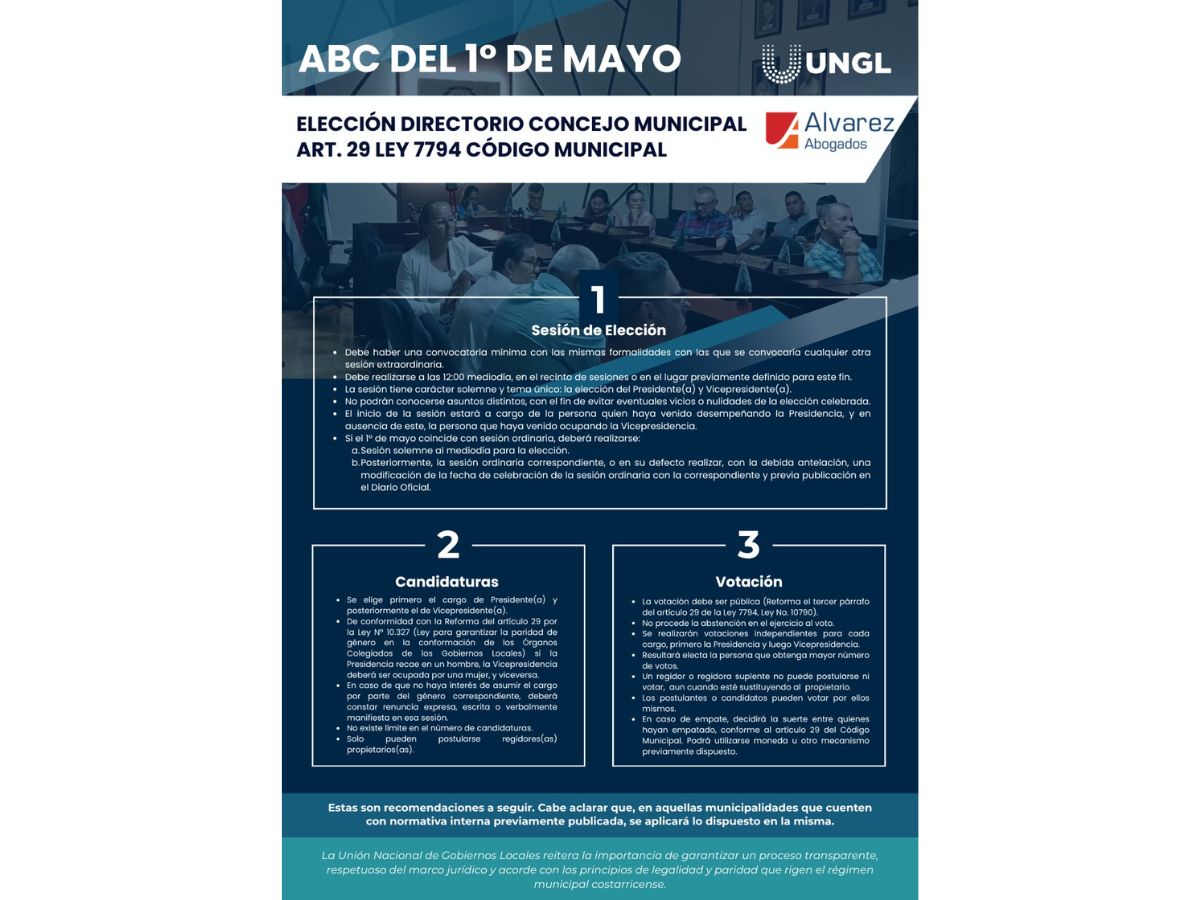 La Unión Nacional de Gobiernos Locales (UNGL), entidad que agremia y representa políticamente al régimen municipal costarricense desde hace 48 años, informa que el próximo 1° de mayo de 2026 los Concejos Municipales de todo el país elegirán a sus Presidencias y Vicepresidencias mediante votación pública, procedimiento que se aplicará por primera vez tras la reforma al artículo 29 del Código Municipal aprobada a finales de 2025 (Ley N.° 10.790).